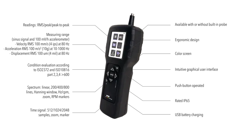 Lo strumento misura con una sonda incorporata (VC200) o con un trasduttore esterno. È controllato da un pulsante e i dati di misura di base vengono inseriti manualmente. I risultati di misura valutati sono indicati da simboli verdi-gialli-rossi e vengono prodotti un segnale temporale e il suo spettro FFT per un facile riconoscimento dei modelli. I risultati di misura possono anche essere trasferiti in un file per un'ulteriore elaborazione, ad esempio in Microsoft Excel.