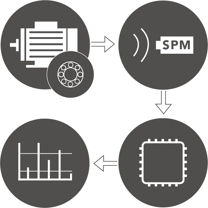 Shock pulses from the bearing are propagated through the material and picked up by the transducer. It converts the shocks to electric signals, which are processed to provide a carpet value and a peak value.