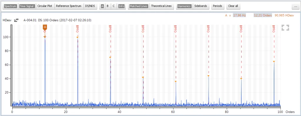 The method uses multiples of rotational speed (orders), rather than absolute frequency (Hz). The purpose of using orders is to lock the display to the rotational speed (1X) and its multiples, meaning that the ordered components in the spectrum always remain in the same position even if the rotational speed varies during measurement.