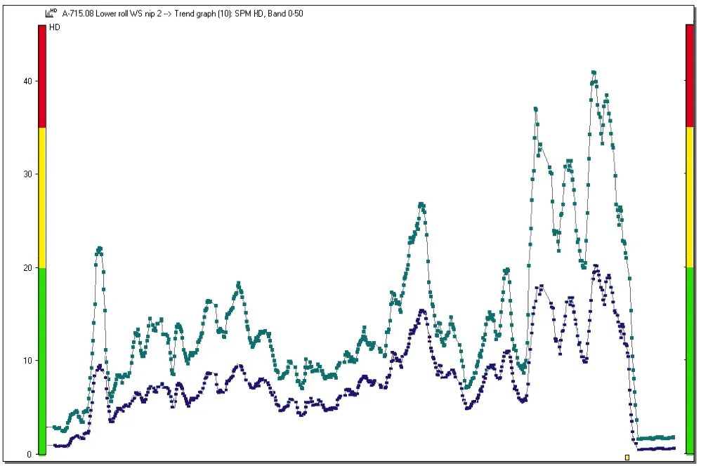 Testing bearings under variable operating conditions have empirically established the initial value and the range of the three condition zones (green-yellow-red). The maximum value places the bearing into the condition zone. The height of the carpet value and delta (HDm minus HDc) indicate lubrication quality or problems with bearing installation and alignment.