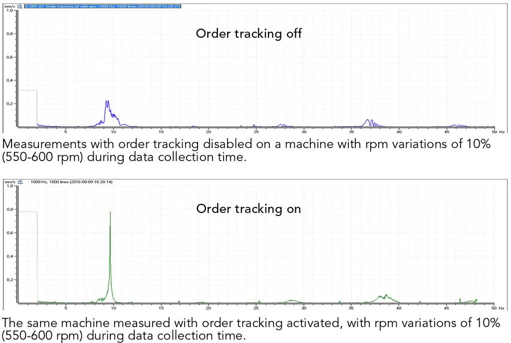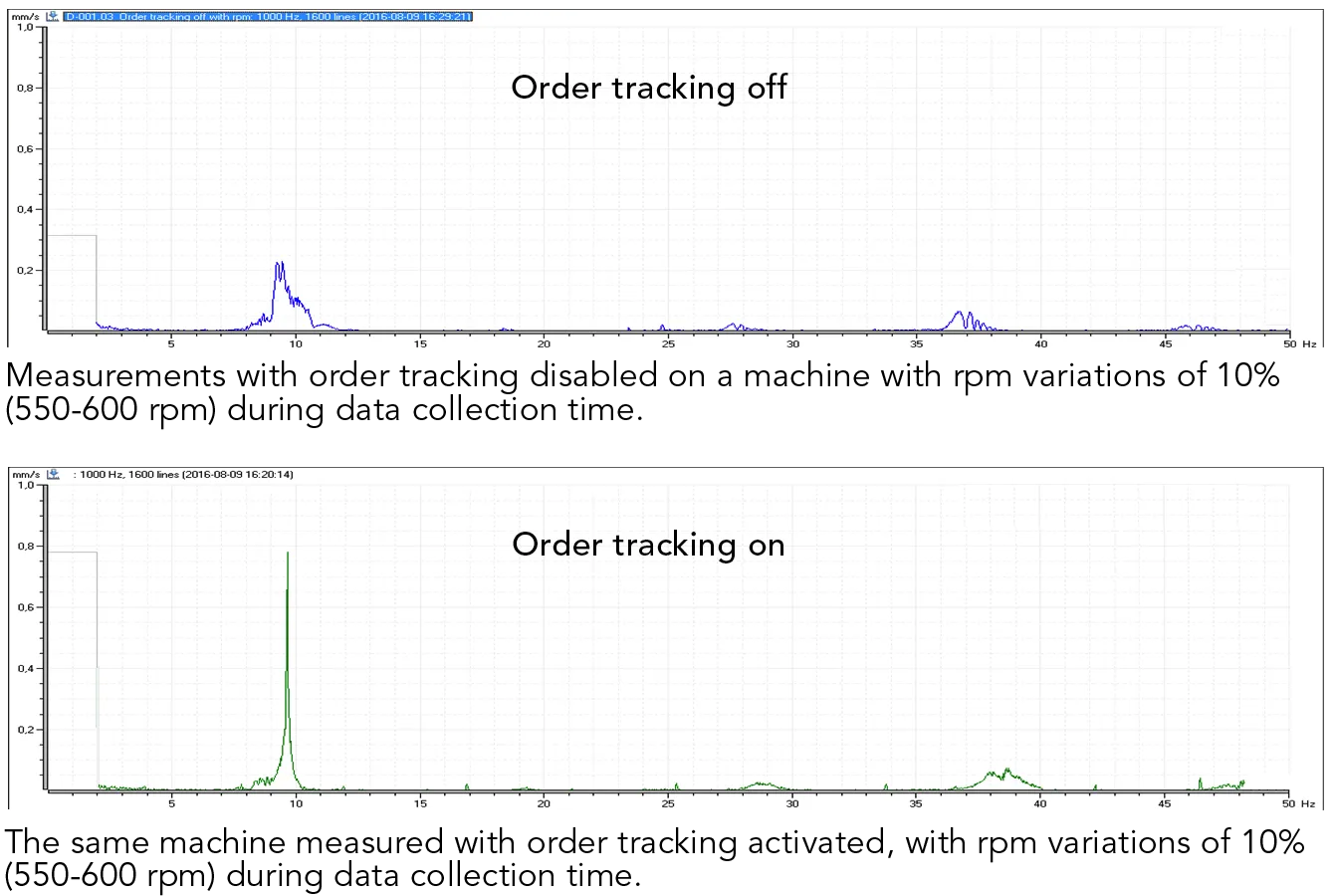 Two or several spectra from the same machine with variable speed can, therefore, more easily be compared if they are expressed in orders. With order tracking, the frequency range always covers the symptoms of interest, regardless of the rotational speed of the machine.
