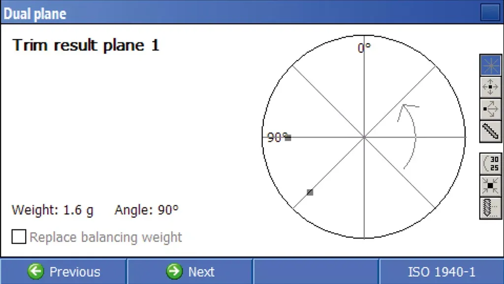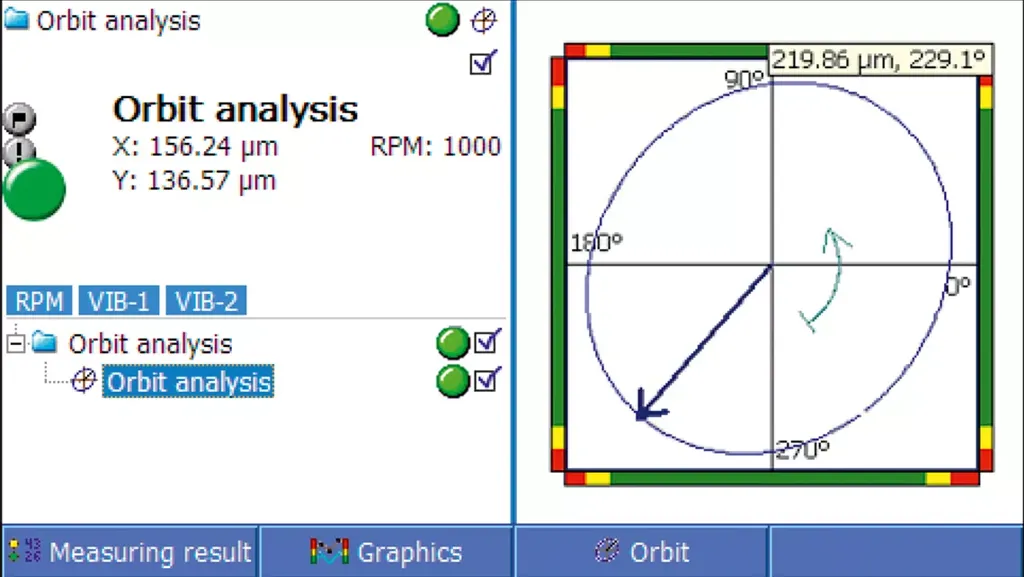 Field rotor balancing in single and dual plane according to ISO 1940-1 standard with an initial vibration measurement guiding the user through a balancing procedure with suggestions for correcting the imbalance.