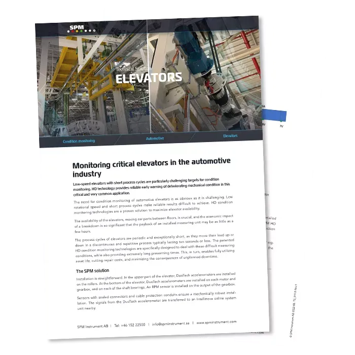 This condition monitoring solution for low-speed automotive elevators with short process cycles provides early warning of deteriorating mechanical condition. The availability of automotive elevators is crucial, and the economic impact of a breakdown is so significant that the payback of a condition monitoring solution may only be a few hours.
