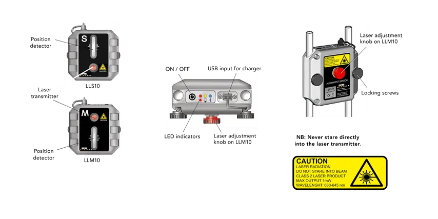 De två mätenheterna är identiska med undantag för placeringen av laserdioden/detektorn samt ett vred för justering av lasern på ‘M’-enheten. Enheterna kommunicerar trådlöst med Leonova Diamond via Bluetooth.