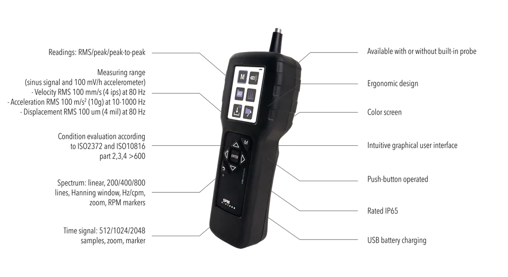 Med hjälp av en inbyggd prob eller extern givare mäter VibChecker RMS-vibrationsnivåer som enheter för hastighet, förskjutning och acceleration, samt vibrationernas allvarlighetsgrad enligt ISO 2372/10816.