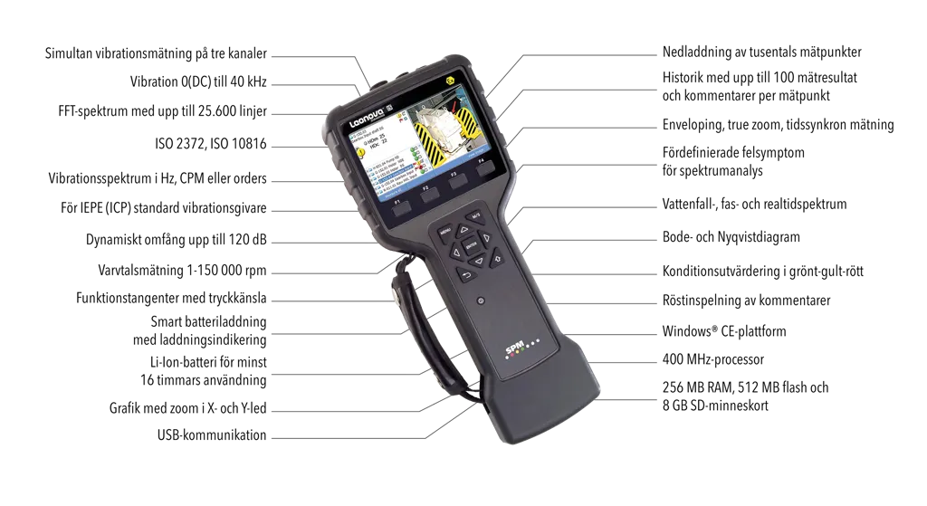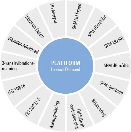 Leonova Diamond IS inkluderar mätmetoden SPM HD® (Shock Pulse Method High Definition) för lagermätning, avancerad vibrationsanalys på tre kanaler för diagnostisering av övergripande maskinkondition, samt många andra funktioner.