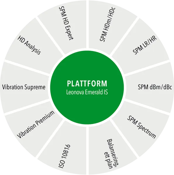 Leonova Emerald IS inkluderar High Definition Shock Pulse Method (SPM HD®) för mätning av lagerkondition och avancerad vibrationsanalys för diagnosticering av allmän maskinkondition, samt många fler funktioner, se nedan.