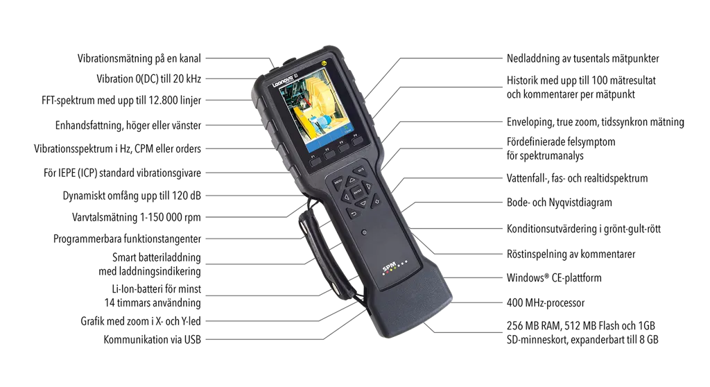 Leonova Emerald IS inkluderar High Definition Shock Pulse Method (SPM HD®) för mätning av lagerkondition och avancerad vibrationsanalys för diagnosticering av allmän maskinkondition, samt många fler funktioner, se nedan.